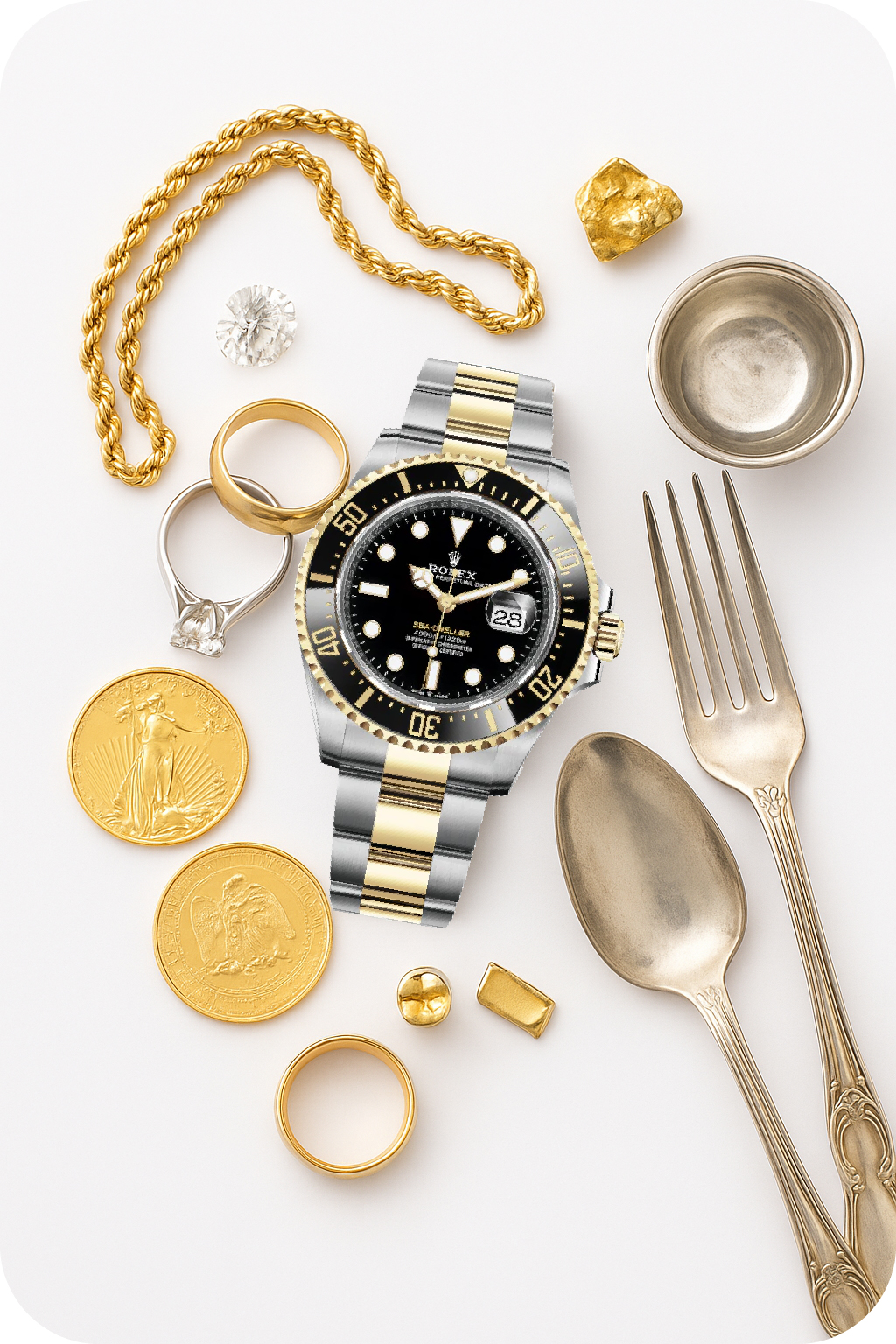 Sell diamond jewelry, loose stones, and luxury watches from top brands. Professional evaluation, no pressure, and instant payment available.