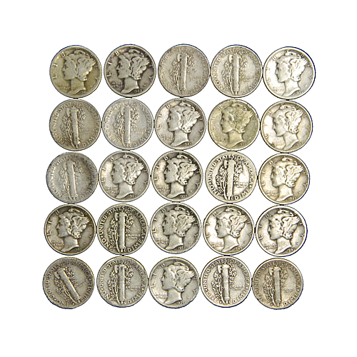 25 Random 90% Silver Mercury Dimes, $2.50 Face Value